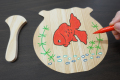 カラーペンで絵付けを楽しんでいただいた後、柄のスリットに木工用ボンドを付け、扇と接着してください。木工用ボンドが乾いた後、うちわとしてご使用いただけます。